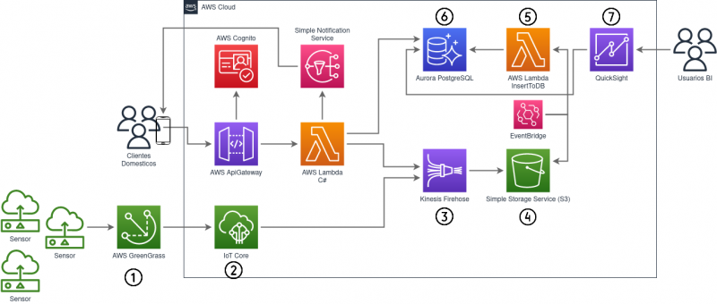 La arquitectura se basa en una ingesta de datos IoT en tiempo real, una aplicación móvil React Native disponible para iOS y Android que accede a una API que se ha desarrollado en SAM (Api Gateway + Lambda) con notificaciones vía SNS, y por último con una visualización de los datos globales con QuickSight.